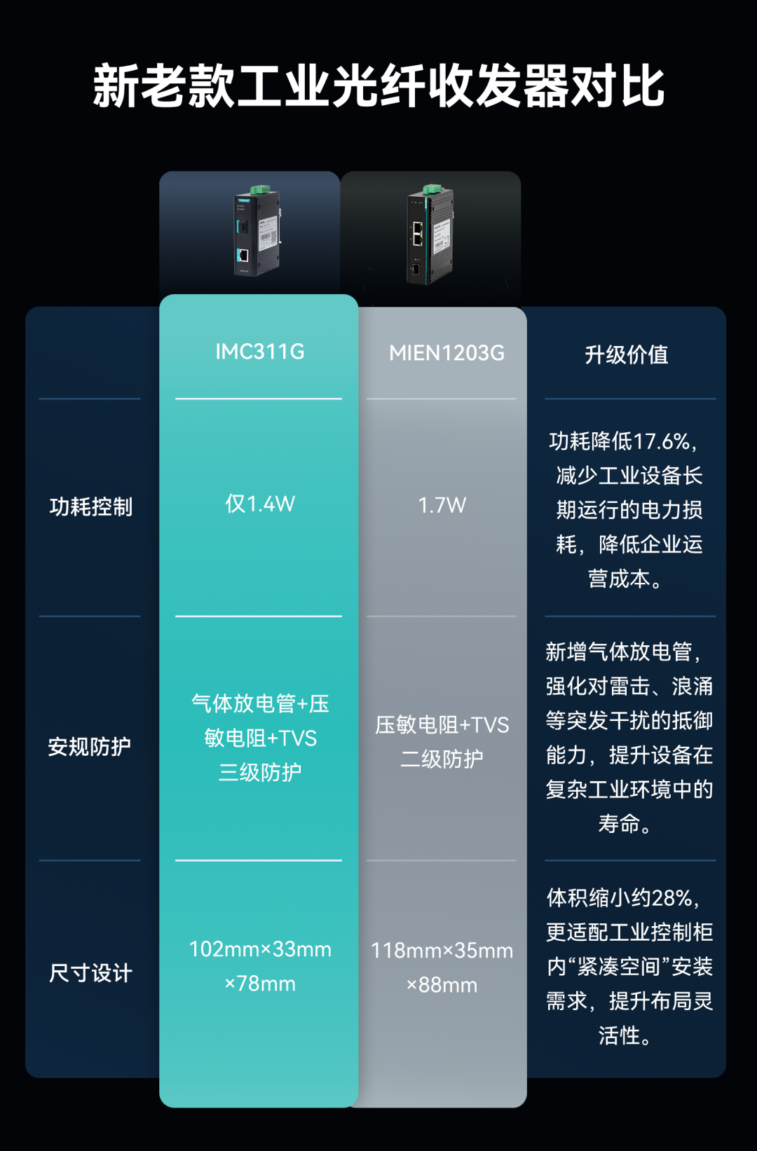 与经典型号MIEN1203G相比,IMC系列(以IMC311G为代表)在功耗、防护、尺寸这三个核心维度实现了跨越式提升,更契合工业场景的严苛要求:
