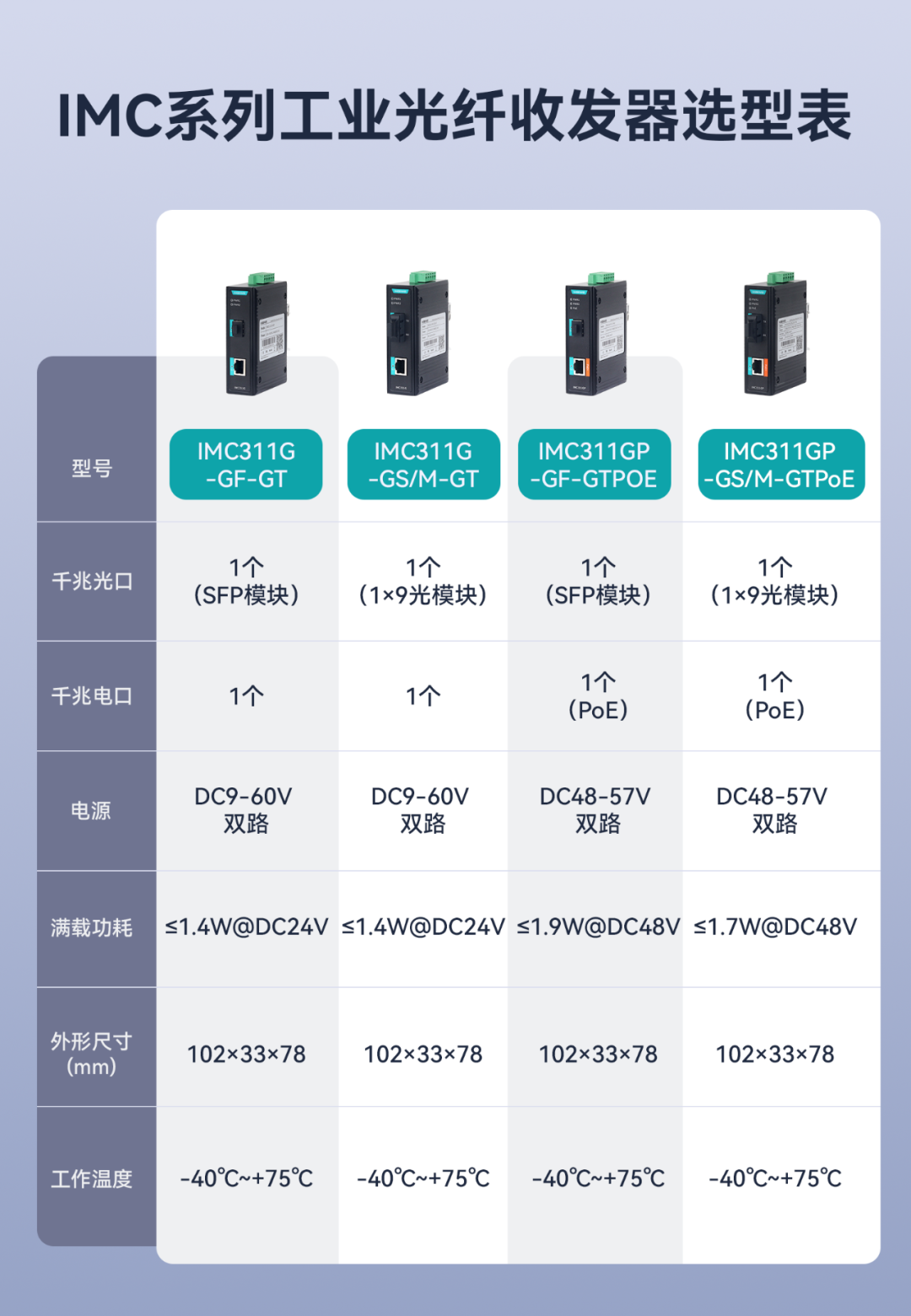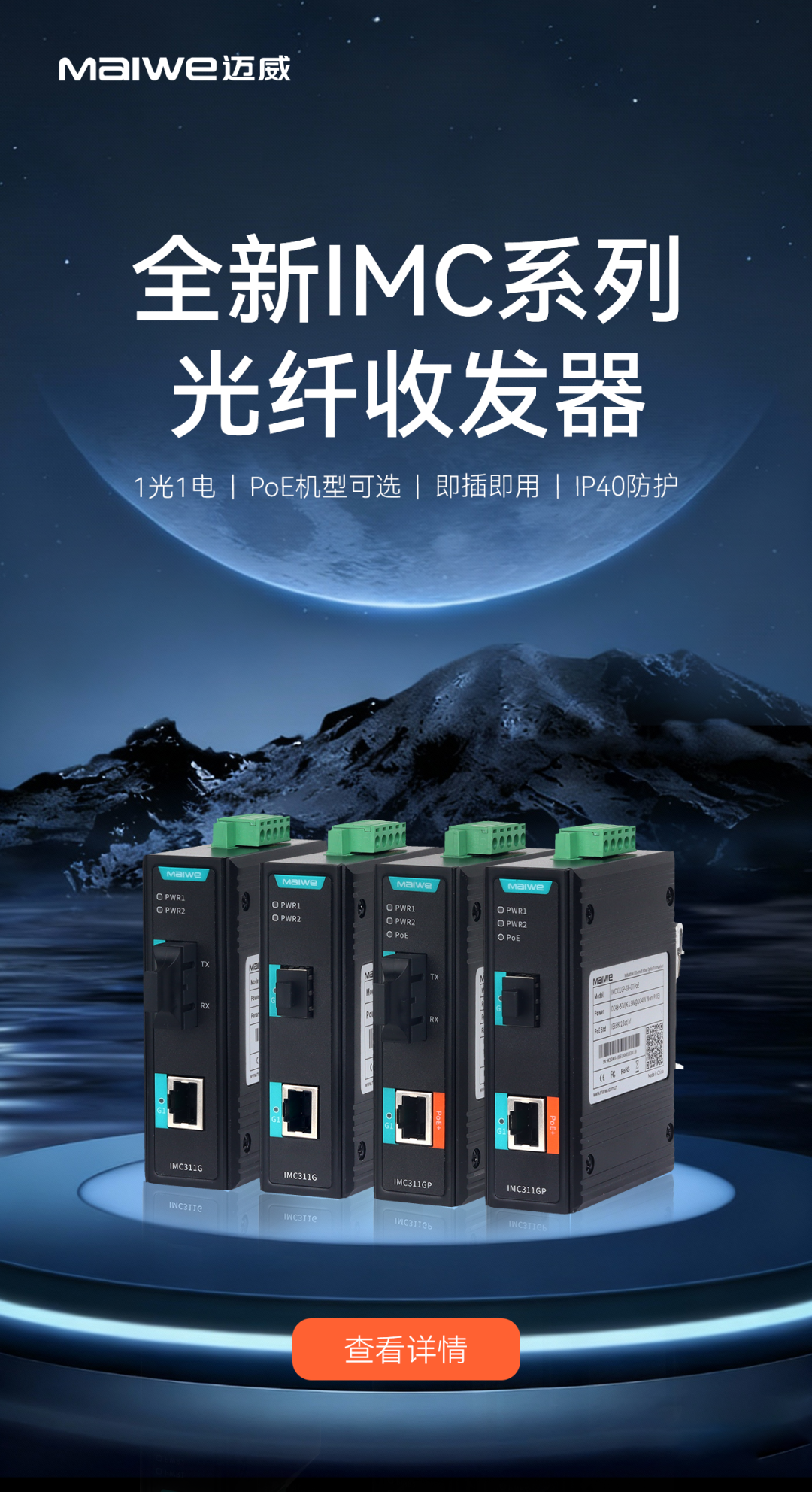 IMC系列实现了底层技术突破,支持SFP/SC/FC/ST等多种光口形态,电源选项可灵活适配工业场景。同时以 “IMC” 统一命名体系,建立清晰的品牌识别标识,强化 “迈威工业媒体转换器” 的专业形象,让客户能快速识别其技术基因与品质保障。